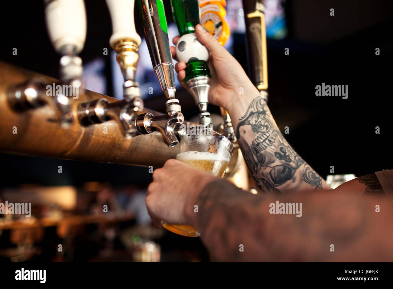 Tattoos On Arm Of Bartender Pouring Beer Stock Photo Alamy
